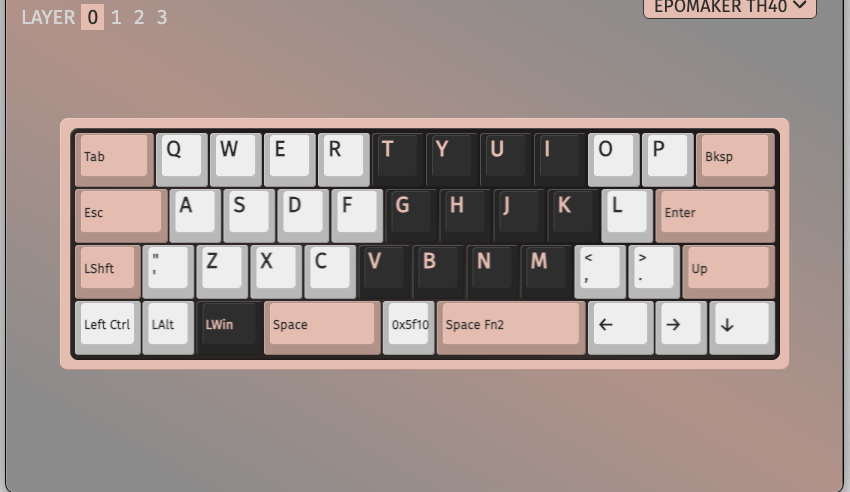 O meu teclado TH40 foi configurado em 3 camadas (layers), sendo a primeira delas ativada