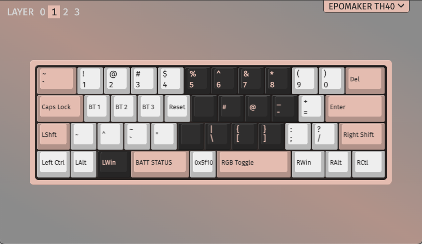 O meu teclado TH40 foi configurado em 3 camadas (layers), sendo a primeira delas ativada